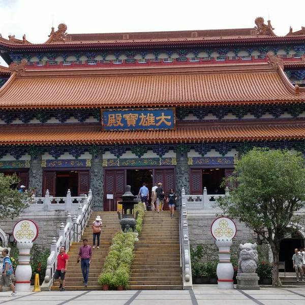寺院规模很大,天坛大佛是寺院的组成部分,登过大佛后,可到山下的宝莲寺一坐,或到斋堂吃一顿素斋,山水豆腐花是值得一吃的。我们平时吃的豆腐花是咸的,而那里是甜的,有股杏仁露味道。