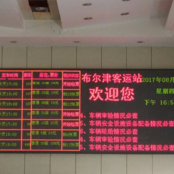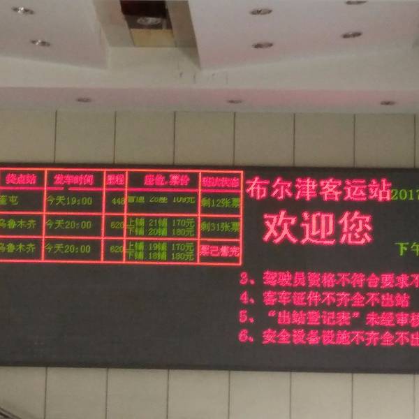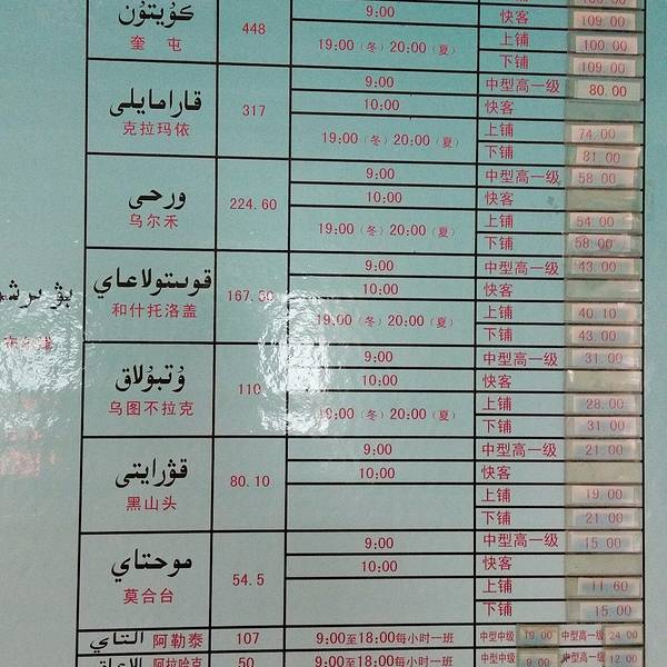 路上路过了一片湖泊,似乎叫北疆海岸。到了布尔津汽车站,物价就平易近人多了。这是布尔津通往各地的班车时刻表和票价,我们最后买了下午5点半的末班车,到北屯市2小时,最后司机图小便宜,一个人收了5块钱,把我们直接拉到了火车站。北屯汽车站到火车站这一段距离打车一般是20.其实我们或许应该选择坐大巴,晚上8点走,第二天早上也就到乌市了,新疆的铁路太不靠谱了,后面我会详细说。到了北屯火车站就去取票,8点半的火车,我们7点10几分就到了,结果车站通知当天所有火车都晚点。。