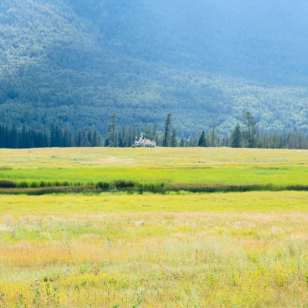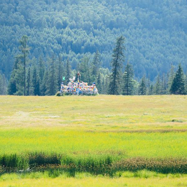 鸭泽湖位于喀纳斯景区内,由喀纳斯河改道后废弃河段牛轭湖洼地组成,形状好似一只蝴蝶。鸭泽湖西边是喀纳斯河,四周环绕着茂密的森林。湖面面积约1.3万平方米,湖周开阔平缓,湖泊似镜,夏天有成群野鸭、大雁、天鹅在湖区栖息游弋,繁衍生息。稍受惊吓,即可看到它们成群结队渐次飞起,翅膀拍打着水面,十分壮观。而周围隐约可见牛羊成群,白色的蒙古包星星点点,帐篷前炊烟袅袅,与青山和白云构成一幅天然的巨型山水画,令人赏心悦目。鸭泽湖西北方临河的草原高地上,有一处石堆,那就是“敖包”,图瓦人每年定期在此开展祭祀活动和过“敖包节”,祈求六畜兴旺、家人平安。