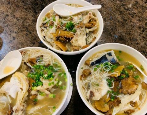 这家看似普通的茶餐厅其实内藏玄机,还被本地人戏称为“女士补身秘店”。这家店的秘密在于各式米面的特色汤底,汤底中加了鸡肉、木耳、红枣、冬瓜和多种药材共同熬煮,充满酒香与鸡的鲜味,既滋补又美味。