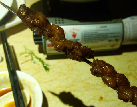 ...是招牌,羊肉煮的很烂,基本没有膻味,有一点点微辣,吃完了还能加涮菜,羊肉串,很大一串,货真价实