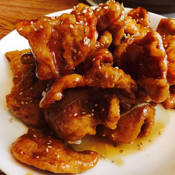 鲍鱼小土豆,这个味道很好,小土豆凉了更好吃,推荐。锅包肉,有拔丝,口感偏甜一些,凉了也更好吃,推荐