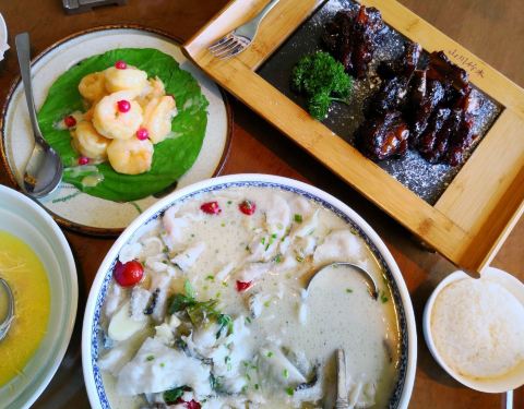 这里的景色太好了,我们到的早,所以挑了最佳的望湖位置。菜品也非常好吃,一个冬雪寻梅小排骨是热菜,菜美味美。一道淮扬干丝,很见功底。酸菜鱼片薄薄的,泡姜是亮点。果汁明虾球味道很好,受到了爸妈的喜爱。...这里的景色太好了,我们到的早,所以挑了最佳的望湖位置。菜品也非常好吃,一个冬雪寻梅小排骨是热菜,菜美味美。一道淮扬干丝,很见功底。酸菜鱼片薄薄的,泡姜是亮点。果汁明虾球味道很好,受到了爸妈的喜爱。两个小点心是桂花南塘糖水鸡头米和杨枝甘露,小盖盅盛来很有感觉,鸡头米软糯,强过后面在东山吃的味道。米饭稍贵哦,哈哈哈。是唯一吃过有服务费的白米饭