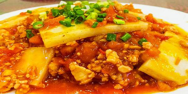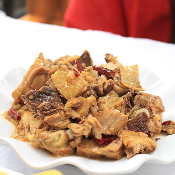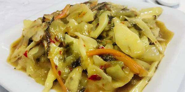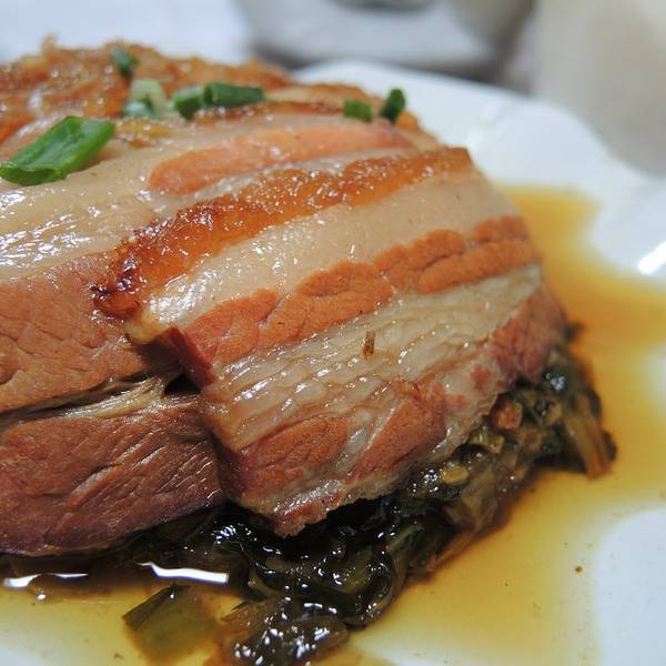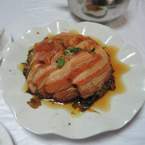 - 我们上午吃了不少零食,所以中午就点了两个网上口碑最好的菜,家常豆腐和酸菜扣肉,一荤一素,搭配合理金骆驼