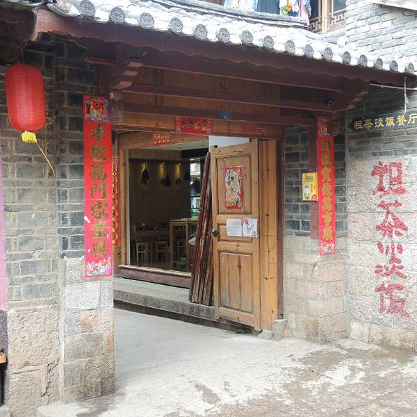 我们之所以选择在粗茶淡饭吃饭有两个原因。首先在网上看到这个店的时候对店名感觉很好奇。其次顾客对店里面的菜品评价都很高。第一次来束河古镇靠着高德地图导航找到了这个特色小店。在店门口看到用红漆写在大理...我们之所以选择在粗茶淡饭吃饭有两个原因。首先在网上看到这个店的时候对店名感觉很好奇。其次顾客对店里面的菜品评价都很高。第一次来束河古镇靠着高德地图导航找到了这个特色小店。在店门口看到用红漆写在大理石柱上又大又醒目的四个字:粗茶淡饭。看到这四个字给人的第一映像是:它们家的菜都做得很家常,在这里可以大块吃肉,大口喝酒,很有家的感觉。进入门口经过一条走廊就可以看到饭店的整体结构了。饭店分为两层:楼下右侧有四五张桌子供客人吃饭,再往里面走是个收银台;楼上一左侧有四张桌子,右侧有个厅里摆放四五张桌子。我们坐在靠左边最里面的一张桌子。点菜的菜单很有特色:白底黑字,上面写着:粗茶淡饭,十年老店,真诚服务。我们点了牛肉土豆煲58rmb,酸菜小笋28rmb,一瓶大理v8啤酒8rmb,米饭3rmb/人,碗筷1rmb/人,提供免费的玫瑰花茶,两人一顿饭总共花费102rmb。牛肉土豆煲是店里的招牌菜,牛肉很大块量也很足,砂锅地下铺着土豆块,上面是大块牛肉里面汤汁浓郁,看了就诱人。牛肉炖得软糯,土豆块吸收牛肉汤汁别有风味。酸菜小笋酸爽可口,解油腻,和牛肉土豆煲真是绝配。米饭一碗3rmb/人也是很超值,是我们这几天吃到的最好吃的米饭。把牛肉土豆煲的汤汁浇到米饭上真是绝配,吃了三大碗饭,喝着啤酒把两个菜都给消灭光了。菜的分量很足。我们两个都吃得很饱。饭后喝着玫瑰花茶,消化消化。总之在束河乃至丽江古镇,去粗茶淡饭就餐都是不错的选择。