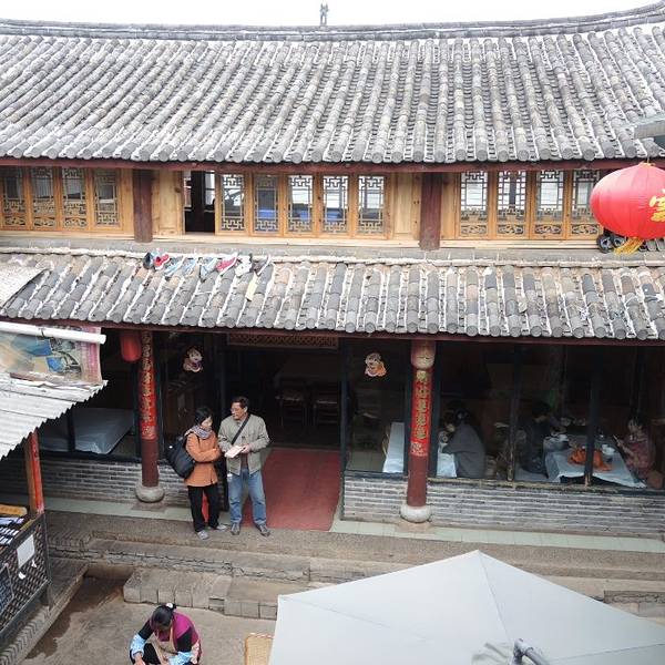 束河的“四方街”远没有大研的“四方街”宽大,一圈老房子围成一个四四方方的空场,地面用青石板铺就,倒是一派古朴厚重的样子。四方街里只有几个等人的游客和拉客的导游,显得冷冷清清的。在四周的店铺里随便转...束河的“四方街”远没有大研的“四方街”宽大,一圈老房子围成一个四四方方的空场,地面用青石板铺就,倒是一派古朴厚重的样子。四方街里只有几个等人的游客和拉客的导游,显得冷冷清清的。在四周的店铺里随便转了转,卖的还是一路上看惯了的东东:围巾,手镯之类的。此刻,时间已到中午,也是该吃午饭的时候了。看看带来的攻略,网上口碑甚佳的平民美食餐厅“粗茶淡饭”就在四方街附近,真是太好啦,要什么来什么呀!经过一番打听,在四方街的一条岔路上,找到了我们既定的的午餐地点:粗茶淡饭餐厅。我们在二楼坐定,服务员给我们送来菜谱、餐具和茶水后就安静地离开了,显得很懂规矩!我们打开菜谱第一页,都是网上很受赞扬的招牌菜,几乎是一页打尽了!今天就在这页里点菜喽!说实话,这菜价也不算特别平民呀 !您觉得呢?我们上午吃了不少零食,所以中午就点了两个网上口碑最好的菜,家常豆腐和酸菜扣肉,一荤一素,搭配合理。第一次来束河,在“粗茶淡饭”吃了很满意的一顿午餐,淳朴鲜美,难以忘怀。推荐此餐厅!