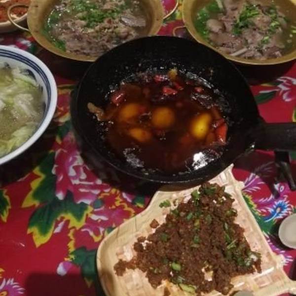 住宿搞定之后就解决肚子,找到了附近一家跷脚牛肉(乐山名小吃),感觉还不错,好像有明星来这里吃过。45一小锅,够两个人吃了。