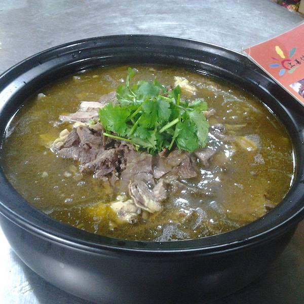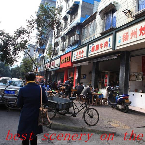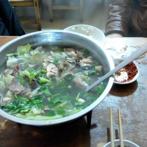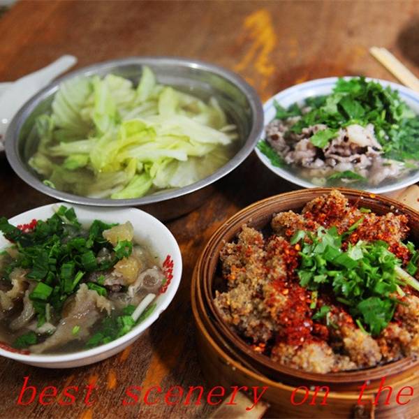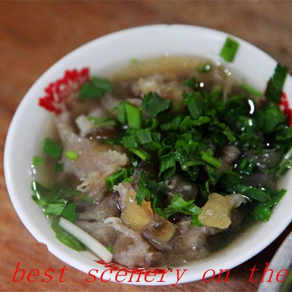 乐山美食第三名:顺城街的无名“跷脚牛肉” 带着满口的豆花清香,我们沿着江边漫步,既饱览了江景,还欣赏到了几位“浪里白条”在中流击水的豪迈壮举。走得有些累了,我们坐在江边的茶馆休息一会儿。茶馆里坐满了茶客,喝一杯香茶,聊一阵闲天,四人一桌垒垒方城,欢声笑语间,一个个下午就愉快地度过了。人生如此安逸快活,夫复何求?乐山人(抑或是四川人)硬是会享受人生呀! 茶喝足了,腿歇好了,我们起身到老城区的小巷里走动走动。走了几条街巷,看到一个小市场(好像是农贸市场)。进去一看,都是本地居民在购买日常生活品。紫檀好奇,也进去看看,突发灵感:在此买东西一定物美价廉,而且几乎可以保证没有假货呢!和喵喵一说,当即决定就在这个小市场买些土特产带回北京!于是买了若干的红花椒,绿花椒(藤椒?),辣椒面,干辣椒,装了两大包,价钱比在大城市问的实惠多了。老板可能平时很少接到这样的大生意,态度特别好,脸上的笑纹一直不曾隐去。我们心满意足,满载而归! 晚饭我们按计划吃的是乐山最富盛名的“跷脚牛肉”。在江边和附近找了好一阵,终于发现顺城街附近的一家很小的无名饭铺门口,立着一块木板,上书:“跷脚牛肉”。我们走进去一看,当街的灶台上,一口巨大的锅里不断翻滚着浓白的牛肉汤,里面还有些许固体物质在随波舞动。扑鼻的肉香瞬间打开了我们的胃口,于是就坐点菜。其实也没有什么可点的,一共就两个品种:荤的和素的。我们点了两个荤的,就是两碗跷脚牛肉,一个素的,就是翘脚素菜。总体来说,翘脚荤素都挺不错的,主要是牛肉味道很足,汤很鲜美,杂碎很软烂,虽不是入口即化,但也绝不柴艮,感觉很肥满丰腴,吃得满口润泽膏厚。趁热入嘴,味道果真不错,就是吃到后来,有些冷了,觉得牛油有点腻,另外,可能是不该与凉啤酒相配吧,吃完了就觉得嘴唇有一层薄薄的油花凝住了似的,很不得劲。紫檀同学的肚子难受了一阵儿,回客栈赶紧用热水吃了一粒氟哌酸,过了好一阵才缓过劲来。所以,千万不要配凉啤酒呀!
