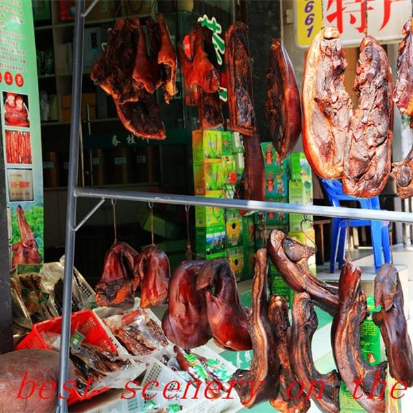 茶喝足了,腿歇好了,我们起身到老城区的小巷里走动走动。走了几条街巷,看到一个小市场(好像是农贸市场)。进去一看,都是本地居民在购买日常生活品。紫檀好奇,也进去看看,突发灵感:在此买东西一定物美价廉,而且几乎可以保证没有假货呢!和喵喵一说,当即决定就在这个小市场买些土特产带回北京!于是买了若干的红花椒,绿花椒(藤椒?),辣椒面,干辣椒,装了两大包,价钱比在大城市问的实惠多了。老板可能平时很少接到这样的大生意,态度特别好,脸上的笑纹一直不曾隐去。我们心满意足,满载而归!