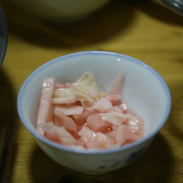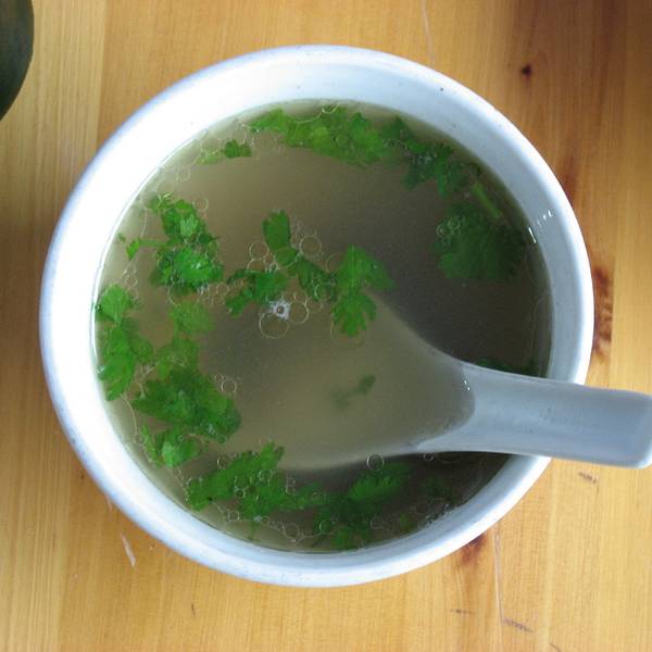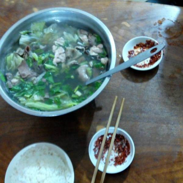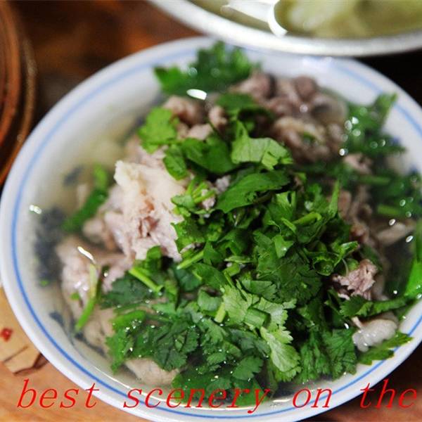 - 端上桌来,蘸调料食之,口感清爽脆利,伴着肉汤的鲜美,味道好极了。我们心满意足,满载而归
