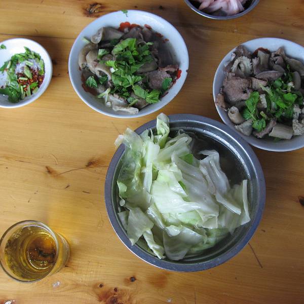 晚饭我们按计划吃的是乐山最富盛名的“跷脚牛肉”。在江边和附近找了好一阵,终于发现顺城街附近的一家很小的无名饭铺门口,立着一块木板,上书:“跷脚牛肉”。我们走进去一看,当街的灶台上,一口巨大的锅里不断翻滚着浓白的牛肉汤,里面还有些许固体物质在随波舞动。扑鼻的肉香瞬间打开了我们的胃口,于是就坐点菜。其实也没有什么可点的,一共就两个品种:荤的和素的。我们点了两个荤的,就是两碗跷脚牛肉,一个素的,就是翘脚素菜。总体来说,翘脚荤素都挺不错的,主要是牛肉味道很足,汤很鲜美,杂碎很软烂,虽不是入口即化,但也绝不柴艮,感觉很肥满丰腴,吃得满口润泽膏厚。趁热入嘴,味道果真不错,就是吃到后来,有些冷了,觉得牛油有点腻,另外,可能是不该与凉啤酒相配吧,吃完了就觉得嘴唇有一层薄薄的油花凝住了似的,很不得劲。紫檀同学的肚子难受了一阵儿,回客栈赶紧用热水吃了一粒氟哌酸,过了好一阵才缓过劲来。所以,千万不要配凉啤酒呀!