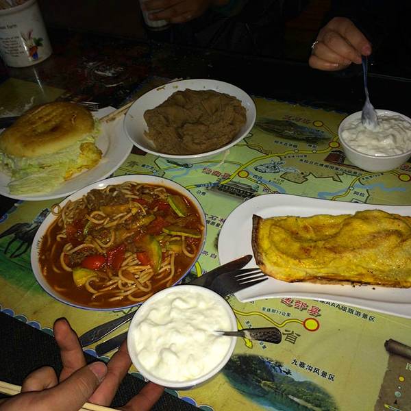 这家丽莎餐厅在各种驴友坛子里都特别的火,说是特别的文艺,有特色性价比高之类的,于是,慕名而来。郎木寺本来就不大,这家餐厅位于进了镇子之后的正街上,靠近右手边。餐厅不大,里面的客人也并不多。我们去的时候掌柜一家人正好也在吃饭。窗外是餐厅手绘的招牌,中英文两种文字的对照,还有一个简单的小地图,感觉比较文艺和小清新。餐厅的menu则显得比较高大上,基本上全是英语的菜品名称,极个别的有一些中文的备注。所以,文化水平低或者不会英语,还没法来这家餐厅用餐,至少点餐都会是一个很虐的过程。餐厅不大,上面挂满了各种户外俱乐部,自驾游俱乐部的锦旗,然后墙上都是驴友们留下来的字条。可以看到,餐厅的装修并不是特别的豪华,甚至只能说很一般。简单的木质桌椅,看不出什么甘南的特色。墙壁上被各种留言贴纸所沾满,有浓浓的祝福,也有殷切而又甜蜜的希望,似乎有一股暖风从外面比较冰冷的空气里面流动了进来,瞬间让人觉得特别的温暖。我们随便点了一些人为比较吃的习惯的。最上面的那个巧克力颜色的,是店家极力推荐的葬吧,用青稞粉和酥油茶捏着吃着,店家介绍捏的时间越久,吃起来就越劲道。但是直到我们用完这段饭,也没有熟悉藏吧的口味,我也丝毫感觉不到劲道。 右下角那个是店里很出名的苹果派,其实有点象国内大多数小吃街卖的那种印度飞饼,然后下面的酸奶,很小一碗。炒面的味道还可以这个是我们点的藏式烩菜,里面就是很多吃火锅时放的那些材料。 总体来说,性价比一般,一餐饭花了200多,实际的体验并没有名气那么好。