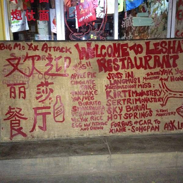 丽莎,可能是郎木寺镇上最为出名的餐厅了,虽说人满为患,但到了郎木寺,不来这吃个著名的苹果派,还是有点小遗憾。店里的环境很有气氛,墙上都贴满了游人们写的东西。这家店名气大,生意也太好了,点餐、送餐会有些慢。