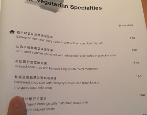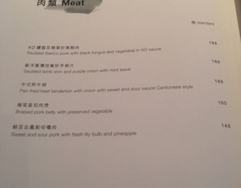 这种地方吃的就是位置和环境,灯光略暗,食物无论是炒菜还是点心都色泽味道都很棒。菜谱先来一波,供食客们参考一下。包间有包间费的,晚上更贵些,好像是6000。那价格真是土豪的吓人。来这种地方的包间吃饭,不点些生猛海鲜的,都不好意思跟服务员招呼点菜吧。看看菜单也是,要是只点炒菜价格应该吃不到吧。那大臂一挥,时令价的海鲜一上桌,一个菜就能造个六千!别说6千,上万都是玩儿似的。来澳门不怕吃不到的,就怕想不到的,不怕你口味挑剔,只要你腰包够鼓!