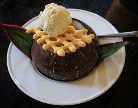 明月餐厅布置十分有格调,为客人提供各式本地及国际美食。超大面积的自助区域,丰富而海量的食物点缀其间,住店客人的早餐就是在这个餐厅享用,度假的时候,每天睡到自然醒,然后到餐厅吃一顿丰盛的自助早餐,因为酒店早餐可以吃到11点。 这里还有精美的粤菜、每日新鲜捕捞的海鲜、以及海南地道美味。从一粒米的选取,一种食材的捕捞,一道汤的最佳温度,厨师的用心幻化为跳跃在您舌尖上的味蕾。 椰子鸡汤,鸡汤清香扑鼻,合着脆嫩的鸡肉,再点缀一点椰肉一起入口,真的特别享受。 海南四大名菜拼盘(文昌鸡,和乐蟹,嘉积鸭,东山羊) 【嘉积鸭】肥而不腻,【东山羊】嫩而不膻,【文昌鸡】皮酥肉滑,【和乐蟹】膏满味鲜。 海南冰淇淋清补凉,内容也算丰富,凉粉,绿豆,红豆,煮花生,银耳,通粉,甜玉米,西米等,水果切丁,红枣制成蜜饯,椰子水和椰子肉榨成汁,滤成椰奶。口感绵密丝滑,甜而不腻的奶味,好吃。 最好吃的是东北大饼,这个绝对是招牌,由于三亚东北客人比较多,东北人喜欢吃馅饼。这个主厨强烈推荐的大饼,一定要吃,记得点韭菜鸡蛋馅的,韭菜很嫩很新鲜,味道一级棒。