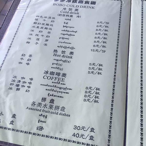 代入感很强的一家缅甸小吃店内,饮品和简餐琳琅满目。千万不要被冷饮店三个字所欺骗,实际上这里的简餐味道相当不错,尤其是多种口味鸡蛋饼十分出色。穿着长裙涂着黄冰粉的缅甸小伙憨厚可掬,上菜时不紧不慢,就是汉语水平还有待提高。