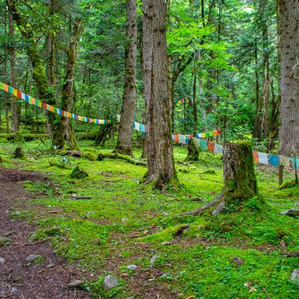 路边森林超级宁静美丽。神瀑是藏民的圣地,一路会有好多经幡,当经幡越来越多的时候,就快到神瀑了先从上雨崩走去下雨崩,有1km左右路程的下坡,会穿过河流,到达下雨崩,朝着梅里雪山的方向前行就是今天目标神瀑。