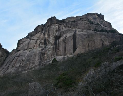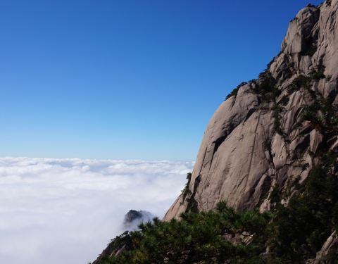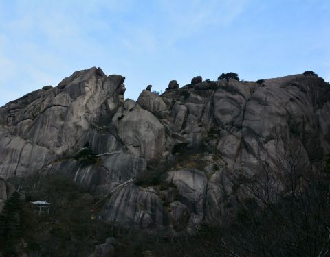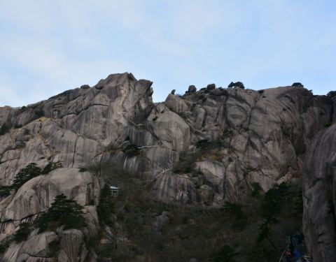 对于这里叫作鳌鱼峰的原因,大概与这座山峰的形状有着莫大的关系吧?从百步云梯通往迎客松方向的地方看这座山峰却是与体型庞大的鳌鱼有着神似之处。