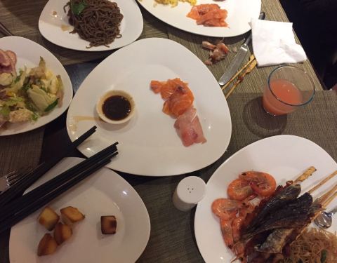 自助餐厅太差了,8点半去吃的早餐,除了没什么品种外,不到20分钟几乎都是空盘,加菜的速度更是极慢,根本吃不饱,更可气的是上了一盆龙眼,里面好多都是发霉的,霉斑清晰可见,一孕妇呼唤服务员换走,服务员拿走后就在开放厨房把霉的挑走留下好的准备继续上,大家顿时傻眼。再来说说晚餐,看不到什么海鲜,都是蔬菜,老公吃了两碗面才半饱,实在看不下去了问了服务员有三文鱼吗,服务员回答我去问问,回来说有这就给你切,好吧回答态度很好,可是想吃什么还要问您要阿,你们藏着干嘛阿?不是自取的阿?晚餐还是吃不饱!下次来住店可以,三餐还是出去吃吧。