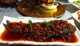 - 鱼身上铺满了胡萝卜丁、酸菜、肉末炒制的浇头,口感酸、甜、微辣,口感爽滑鲜嫩