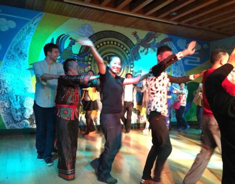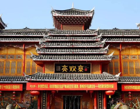 肥美的鱼肉经过酸汤的浸煮,变得更加鲜嫩多汁,这个时候还要蘸上特制的辣椒水,酸爽的鱼肉掺着辣椒的糊香,简直将“鲜”发挥到了极致 为了让大家都吃到这一口祖传酸汤鱼,吴笃琴在1986年的时候就创建了最早的亮欢寨,当时以“快活林”为名,到现在已经是三十几年的历史 经过三十多年的沉淀,亮欢寨的酸汤鱼早已被列入省级非物质文化遗产代表作名录 如今的亮欢寨凯里总店 如今的亮欢寨不单单是凯里酸汤的弘扬地,更是一处集苗侗文化体验为一体的独具民族特色的传统餐饮店 苗家吊脚楼 亮欢寨是贵州第一家用苗家元素来搭建的店,古朴精致的吊脚楼让人仿佛置身于苗寨,墙上精致的壁画刻画着苗侗人家的生活常态,一进店里,就被浓浓的苗侗文化包裹 苗家水车 在苗家用来灌溉庄稼的水车在店门口不停地转动,总感觉水车转的不仅仅是水,更是上千年的苗家农耕文化 苗家服饰 连店里的工作人员都是穿着苗家服饰,或精美华丽,或简单朴素。天然朴实的苗家小姐姐,总是给你一种很亲切的感觉 高山流水 亮欢寨也是第一家将凯里苗侗风俗,搬到贵阳来的餐饮店。高山流水,是苗家向贵宾敬酒的最高礼遇。苗族姑娘的热情好客,全都表现在这碗流不尽的米酒中了 宴席上,几个穿着苗族服装的美丽苗家小姐姐,端来米酒,围在远道而来的客人身边,唱着敬酒歌,还没等你反应过来,就已经被“包围”,开始上演“高山流水” 碗一个叠着一个,一个高过一个,形成斜梯。“高山流水”之前你觉得你的酒量是王者,“高山流水”后,你会觉得你是块废铁 苗家歌舞表演 苗家人的宴席上,除了山歌米酒,自然也少不了精彩的舞蹈表演 身着盛装的苗家小姐姐在绚丽的舞台上轻盈舞蹈,甜美的笑容、婀娜的舞姿,她们将苗家妹子的美丽亲切展现得淋漓尽致 苗家的汉子可以说是粗矿的,也可以说是细腻的。上能用树叶吹曲。下能到河里捞鱼。从话筒里飘来的一曲曲熟悉的山歌,都是用这片平平无奇的叶子吹奏出来 打糍粑 在苗家人眼中,用糍粑招待客人好过用鸡鸭牛羊招待,苗家人无论是逢年过节,还是修房嫁娶都少不了糍粑 作为汉族人,记得小时候只有过年的时候才打糍粑。如今亮欢寨还把它搬来了店里,伴随着紧凑的击鼓声,在场的客人可以随意接力 打好的糍粑,供现场宾客分享,想要品尝