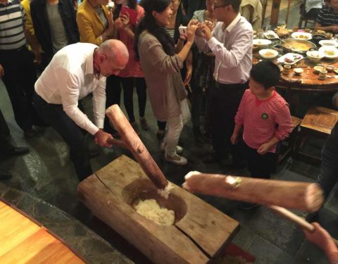 ...它搬来了店里,伴随着紧凑的击鼓声,在场的客人可以随意接力 打好的糍粑,供现场宾客分享,想要品尝