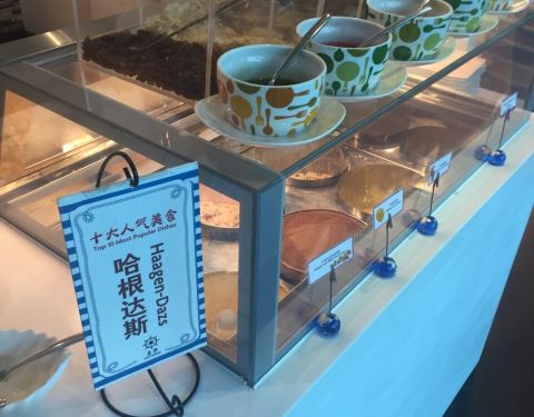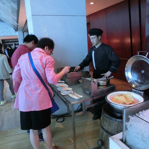 餐厅景观座位真的很不错,边吃边看金鸡湖。自助餐厅的东西也很多,一进去就是甜点去,蛋糕,冰淇淋,水果,饮料。再进去是铁板烧烤区,龙虾,烤肉,扇贝,然后会有海鲜区,还有面点区,品种很多。特别还为小朋友准备了薯条,薯角。最特别的还为小朋友制作一次糖人。