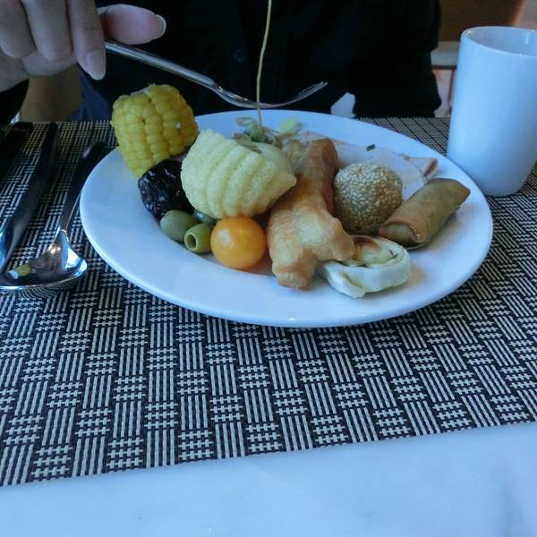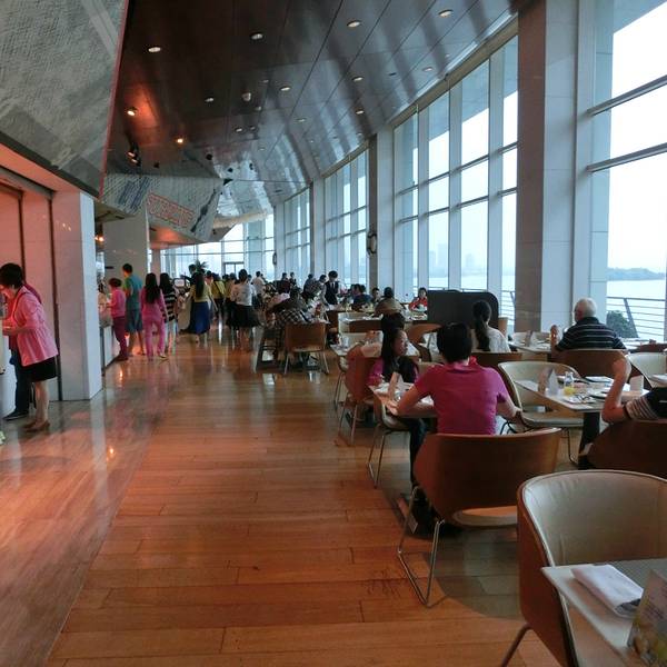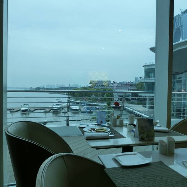 中茵皇冠一楼的西餐厅,是晚餐也是早餐的使用地,就在船酒店的那个靠码头的位置,看出去的风景就是酒店的湖边(其实就是金鸡湖了),可以看着那些坐酒店快艇的人们,还有酒店的游泳池里嬉戏的人们,餐厅的晚餐的...中茵皇冠一楼的西餐厅,是晚餐也是早餐的使用地,就在船酒店的那个靠码头的位置,看出去的风景就是酒店的湖边(其实就是金鸡湖了),可以看着那些坐酒店快艇的人们,还有酒店的游泳池里嬉戏的人们,餐厅的晚餐的三文鱼很好吃,不过我们去了苏浙汇所以没有体验到,最后吃的是酒店附送的早餐。他们家的小馄饨真心特别的好吃,吃了好几碗,旁边一家的阿姨也点了好几碗,可见群众的眼光是雪亮的。其他的菜品,比较中规中矩,就是一般的五星级酒店的一般配置,鸡蛋和面条也都是当场有师傅在煮的,比较热腾新鲜。就这个视野来说还是很加分的,早餐时间是6点到10点。