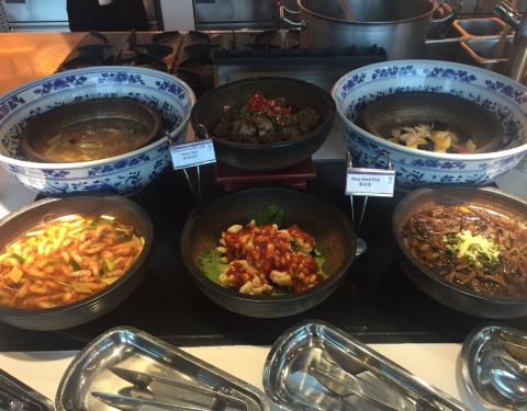 中茵皇冠一楼的西餐厅,是晚餐也是早餐的使用地,就在船酒店的那个靠码头的位置,看出去的风景就是酒店的湖边(其实就是金鸡湖了),可以看着那些坐酒店快艇的人们,还有酒店的游泳池里嬉戏的人们,餐厅的晚餐的三文鱼很好吃,不过我们去了苏浙汇所以没有体验到,最后吃的是酒店附送的早餐。他们家的小馄饨真心特别的好吃,吃了好几碗,旁边一家的阿姨也点了好几碗,可见群众的眼光是雪亮的。其他的菜品,比较中规中矩,就是一般的五星级酒店的一般配置,鸡蛋和面条也都是当场有师傅在煮的,比较热腾新鲜。就这个视野来说还是很加分的,早餐时间是6点到10点。