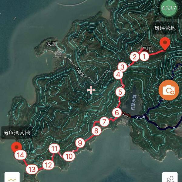 徒步昂坪路-深屈道-羌山道,到石壁营地(沙咀公交站旁)由宏贝路进入凤凰径八段,前进3KM,到达大浪湾营地原本前往煎鱼湾营地,因计划有变,夜宿大浪湾营地