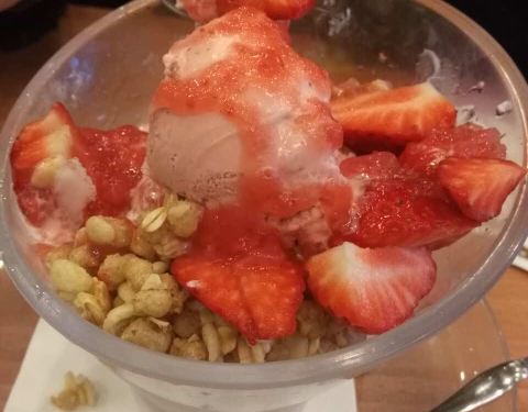 一颗冰淇淋球围着一圈草莓,半圈燕麦??下面冰+奶,最下面还有玉米片??感觉不错