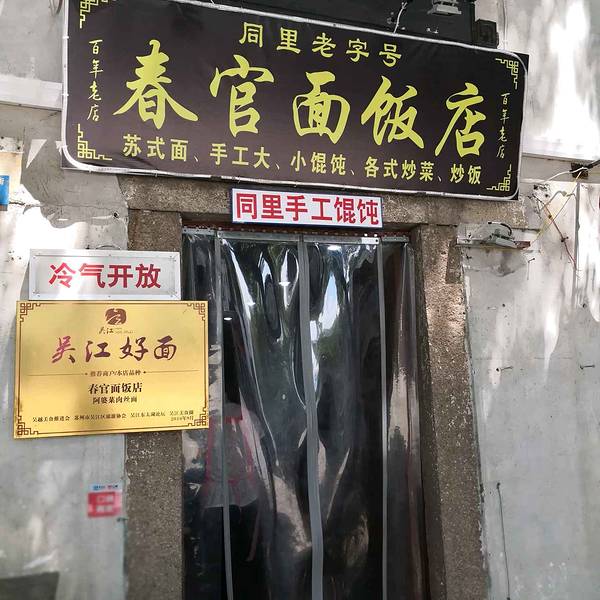 同里古镇相比江南其它几个水乡来说并没有太多特色,有些小吃也差不多,不过没想到在同里馄饨竟然也算是特色,平时就比较喜欢吃馄饨的我自然不能错过,这里的馄饨汤水是酱油汤加猪油,很香,手工现包的青菜馄饨馅...同里古镇相比江南其它几个水乡来说并没有太多特色,有些小吃也差不多,不过没想到在同里馄饨竟然也算是特色,平时就比较喜欢吃馄饨的我自然不能错过,这里的馄饨汤水是酱油汤加猪油,很香,手工现包的青菜馄饨馅料还算多,妈妈的牛肉面据她说牛肉有点老,不过总的来说还凑活。 【春官面饭店】 地址: 中川路(同里影剧院正对面)