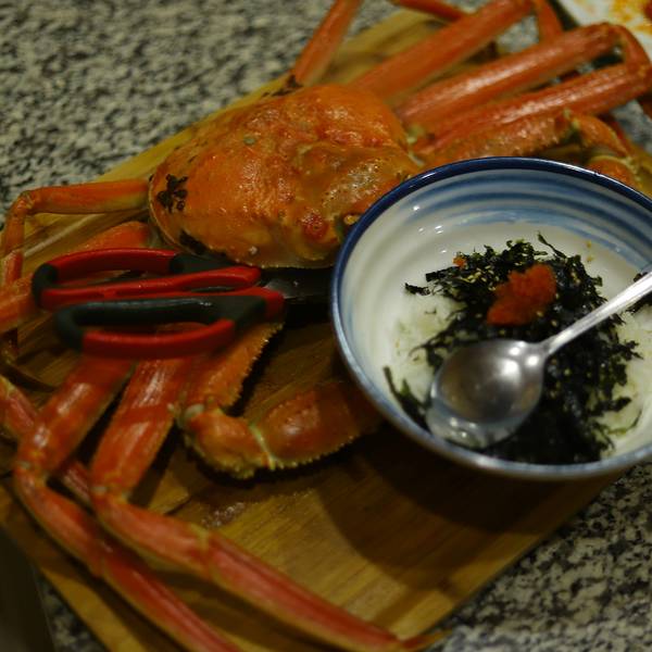这是旅程中最豪华的一顿晚餐 大板蟹、北极贝、拌面、海鲜粥,玉米酒,都超级美味。吃饱喝醉,回家睡觉。话说,这一晚开车我喝了点酒。