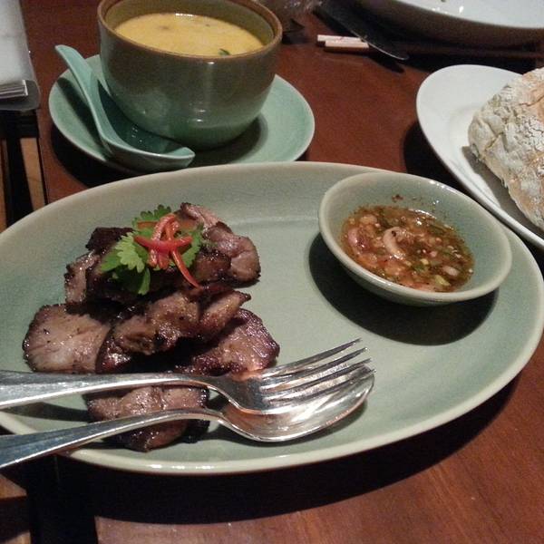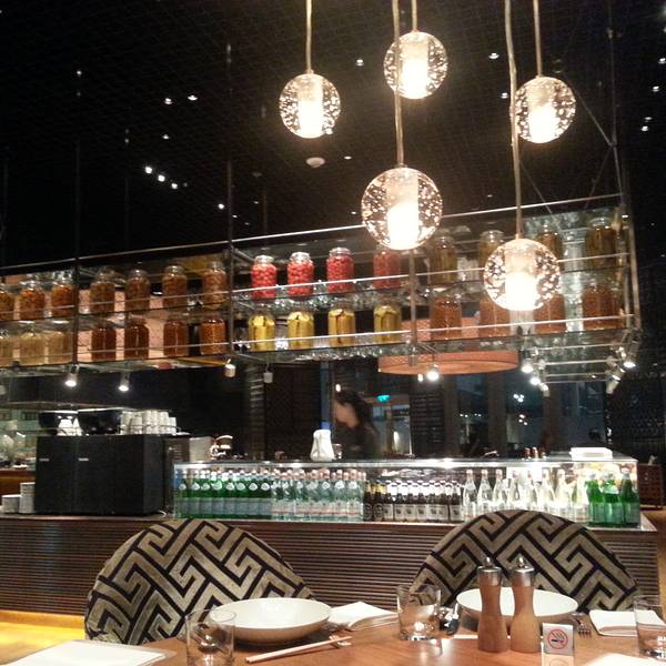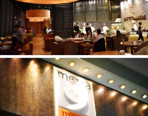 Mezza 9 其实有中文名字的,叫“玖”。它是位于君悦酒店的3楼,从君悦正门进入后,右转到电梯口,然后按3楼就看到了。也可以乘坐新濠天地免费穿梭巴士或者公交车到达新濠天地正门后,然后在美人鱼水幕转右,大约走150米左右便达到君悦酒店的大堂,再转左就看到电梯了。餐厅非常好找,坐电梯上到3楼就立刻看到了,餐厅的装修非常华丽时尚,干净卫生,而且有多个开放式厨房,可以看到厨师们做菜的过程,不过听餐厅经理说,做这个开放式厨房不仅仅可以让客人看到厨师做菜,更是为了让厨师看到客人吃食物表露出来的表情,这样厨师就能加以改进,去烹调更适合客人口味的菜式!整个餐厅的服务都很好,一进门便有美丽的接待员小姐带你到桌位,带领你的同时,餐厅的经理也会亲切的走过来问你需要吃怎样的菜式,点餐的服务员更会问你希望甜品是什么时候上等等,而且用餐完毕后,还会立刻帮你收走餐具,食物残渣等等,服务绝对是100分的。而菜式的话,Mezza 9是一间多种菜式的餐厅,所以如果你喜欢混口味,绝对要首选这里,餐厅提供中国菜、韩国菜、日本菜、澳门菜、西餐等等,人均大约是100左右。而这段时间又新出了泰国菜,所以这次主要就是过来品尝泰国菜。我们5个人点了大约6-7个菜式,例如鲜虾沙拉、小食拼盘、冬荫功汤、芒果糯米饭等等,味道都很不错,而且为了结合中国人的口味,酸、辣都适当减轻了。不过我个人最喜欢的就是那个甜品,那个辣巧克力,非常特别。一口吃进去显示普通巧克力,然后大约过了10秒突然就爆发出一股辣味,然后就吃上旁边的冰淇淋中和,整个品味过程都觉得是一种很棒很新鲜的体验噢!
