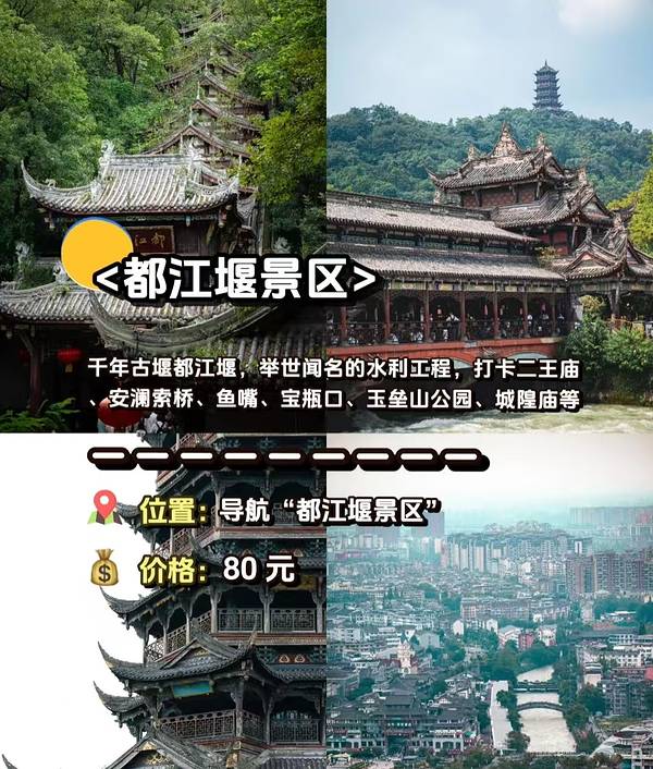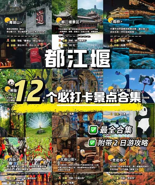 问道青城山、拜水都江堰 国庆期间很多朋友来成都也一定要抽时间去都江堰玩玩 今天就给大家推荐都江堰这12家热门景点 我还自己花精力整理了都江堰美食和2天1晚攻略,需要的宝宝关十私我哦~ - ①青城山 西游记取景地,前山偏人文,后山看风景 位置:导航“青城山”(分前山和后山) 门票:前山80元,后山20元 ②都江堰景区 千年古堰都江堰,举世闻名的水利工程,打卡二王庙、安澜索桥、鱼嘴、宝瓶口、玉垒山公园、城隍庙等 位置:导航“都江堰景区” 门票:80元 ③南桥 火遍平台的蓝眼泪就是这里,建议晚上7点左右来,开灯后拍拍照 位置:导航“南桥” 门票:免费 ④熊猫谷 不仅有“泰山”“暖暖”等明星大熊猫,还可以零距离接触小熊猫,建议9点左右入园 位置:导航“熊猫谷” 门票:55元,学生票27元 ⑤钟书阁 现实版霍格沃兹图书馆,揽获过多项国际大奖的超现实魔幻书店 位置:导航“熊猫谷”(融创茂店)” 门票:免费 ⑥仰天窝广场 迪丽热巴同款打卡地,超大只仰卧自拍熊猫,还有潮玩社区 位置:导航“仰天窝广场” 门票:免费 ⑦西街 都江堰版本的小丽江,接到两边都是民宿饰品店,氛围安静舒适 位置:导航“都江堰市西街” 门票:免费 交通方式: ①乘坐地铁2号线到犀浦站换乘动车,可直达都江堰站或离堆公园站; ②自驾经成灌高速到都江堰也能顺利抵