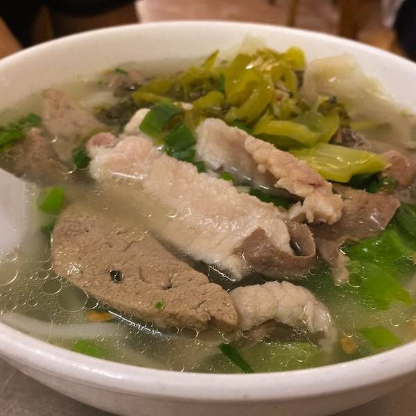 - 粿汁配的料是猪杂,上面还好多酸菜,而粿汁没有想像中好吃。吃上一口,就着豆芽的脆,口感非凡