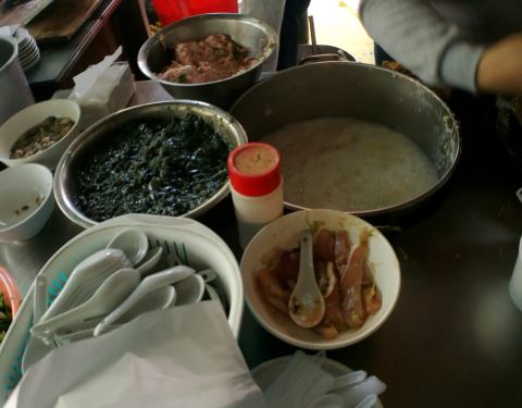 当地食客很多,看到大家有点西洋菜汤、水生蛋肠粉,我们也跟着尝试了一下,西洋菜汤里有猪内脏,一早就吃有点不习惯,但还能接受,汤也清淡没那么油腻。连着两天早上来喝粥,最爱的还是皮蛋瘦肉粥