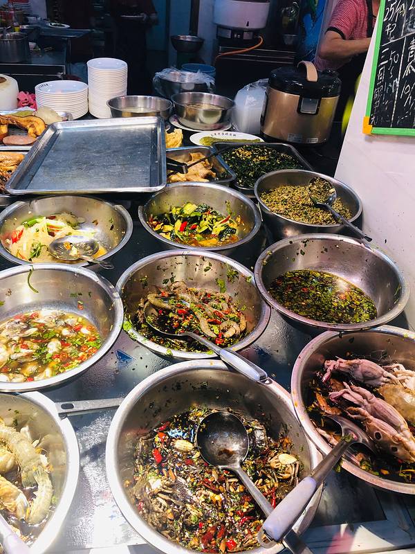 第五道“念念不忘”,依旧大名鼎鼎,长平路上的老姿娘夜粥,墙裂推荐生腌虾和卤水鹅肝。 老姿娘夜粥是汕头一家24小时营业的大排档,生腌海鲜最受欢迎。姿娘,是这里人对姑娘的称呼,老姿娘,意思就是……中年妇女没错。这一顿宵夜中,在点餐上花费的时间最久,因为食品种类实在太多,生腌系列、卤味系列、鱼饭系列、米粿系列、油炸制品、海鲜水产、蔬菜……最后我们只得求助美食类app,斟酌之后选择了白粥,生腌虾和卤水鹅肝。 第一道卤水鹅肝,细腻软嫩到以为自己吃的是舌头,一定要搭配加了蒜粒的白醋,大蒜用来提味,白醋则完全去掉了鹅肝的肥腻。第二道,虽然我们俩不惧怕海鲜,但是考虑到肠胃一天的承受能力,还是选择了看起来相对“清新”的生腌虾,没想到鲜甜的口感,让我俩吃完第一口就停不下来……潮汕人精通十八般海鲜烹调手艺,却对生腌情有独钟,他们认为,生腌能最大程度保留海产的鲜味。生腌海鲜是将海鲜浸在用豉油、辣椒、蒜头、芫荽等制成的腌料中,有的腌一天,有的即腌即吃。生腌配料还有其他讲究,比如下鱼露提鲜,加红糖增甜,放南酒去腥等等,如此种种,对于保留食材“鲜味”的能力,我的确很佩服潮汕人。▲老姿娘业粥的生腌系列。▲只有鱼,没有饭的“鱼饭”。