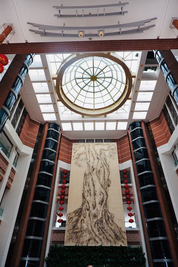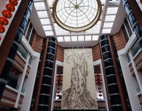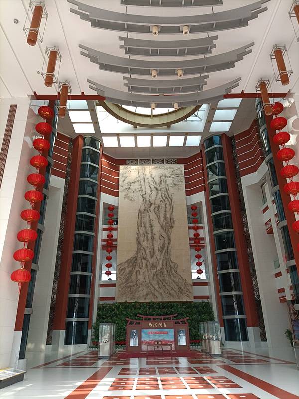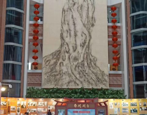 最动人的是大厅那幅火药爆绘画《同文同种同根生》。蔡国强用传统爆竹爆破宣纸,炸出的榕树根系在18米高的墙面上盘桓交错,有的根系向台湾岛方向延伸,虽未相连却气息相通。这种用“破坏”达成的“创造”,恰似两岸关系的隐喻:历经风雨分离,血脉的牵连从未断绝。