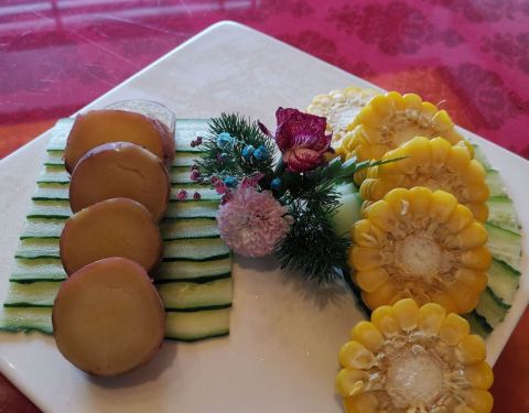 广场尽头,天下第一面。好多人,拼了一桌。天下第一面,一碗是一根面条,很宽,配两碗汤,一碗酸辣,一碗三鲜。服务员会把面条挑起来让顾客拍照,把面条搭在碗边上就筷子掐断,夹到汤碗里就可以吃了。三鲜的汤比较好吃。另外,点了西府搅团,一种面食,味道一般。关中四蒸碗,份量不大,刚刚好,四种蒸菜配白馍,好吃。