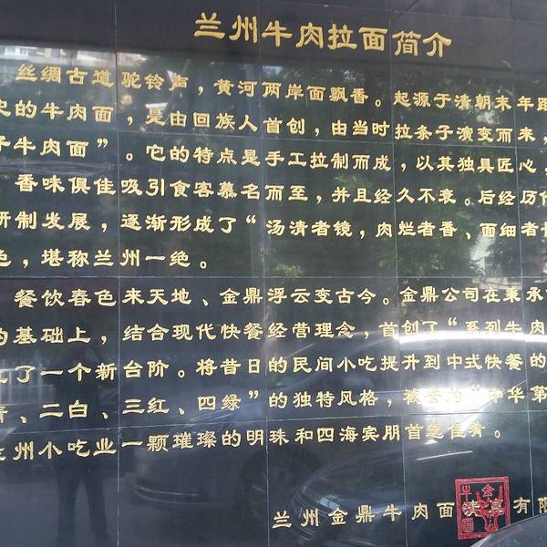 到兰州,怎能不尝尝地道的兰州拉面呢? 头天晚上到达兰州,领略了兰州城市的夜景,第二天一早,我们就上街溜达溜达。在万达广场前,问了当地的一位老奶奶,让她给推荐推荐兰州的地道拉面馆。老奶奶特向我们推荐这家“兰州第一面”,也叫兰州金鼎牛肉面。听名字就够响亮的吧!于是开车导航前往这家店。 这家店并不难找,就是周边的停车位基本没有,得停在旁边的一个单位里。看着牌匾就够气势吧!不愧是兰州第一面! 这家店是总店,共有两层,我们去的时候是上午十点多了,人不算特别的多。由于我们人多,直接上了2楼的甘肃厅。饭店的一层类似于快餐店,还有外卖的熟牛肉!在一进门处就能看见舌尖上的中国兰州拉面传人的易拉宝以及很多的招牌!我们要了些小凉菜和牛肉。不得不说,他家的牛肉做的非常的烂。入口香软,十分有嚼劲。赞!接下来说说他家的面,面很劲道,不粗不细,吃起来很坐实。汤头很讲究,鲜味十足。不愧为地道的兰州拉面!推荐去兰州玩的朋友们不妨去他家吃一吃。