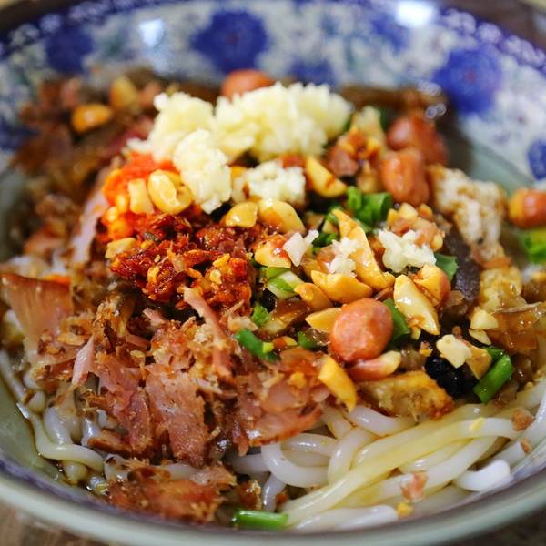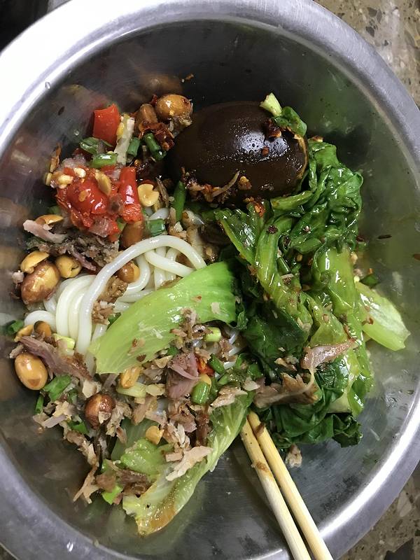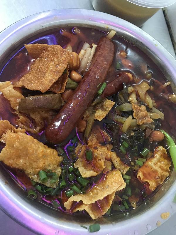 逛完,当然又饿了 向着那个干捞粉前进 还挺好找的 带着期待去的 没想到还有了惊喜 成为了我这次旅行最爱的一款粉 干香,爽脆 关键,看着满满的都是肉啊 柳州 的粉店还是都挺各具特色的 作为一个外地人来说 最好学着人家,避免尴尬,哈哈 因为买的方式不同 有的要点单,有的直接吆喝一声就好 有的吃完再付也不急 这里 一开始是有点那个撒 学着别人朝着阿姨叫了声,来一两干捞 阿姨说,去去去,先点单,咳咳 好吧,人家手头做别人的 然后买好,准备等吃的 阿姨召唤了 要加点什么? 这光线,我也分不出撒子 都来点吧 然后,我只能凭我的感觉来判断 牛腊巴、猪头肉,卤的,炸的,叉烧 一碗小小的粉,料几乎有一半多 配合着辣油,脆花生,还有我爱的蒜 别提有多香了 一两的分量,正好让你回味 我是要了 金山 豆奶 感觉它和 四川 的唯怡豆奶一样,是标配 然后看到人家更省钱 直接打个汤,撒点葱花就好了