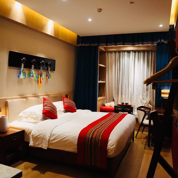 数十年后,幸运陨石重现人间。独克宗花巷正是在“幸运陨石”坠落之地拔地而起,第五颗陨石酒店应运而生。墙上是真的项链柜子上价值好几千的瓷器办理完入住收到一条短信,登录酒店网站可以实现获取房间遥控器,智能控制开门,开关灯,窗帘控制等场景。不用找房卡开门,不用起床拉窗帘,真心太方便了~房间还准备了加湿器,让身处干燥高原并开着暖气的我倍感贴心。