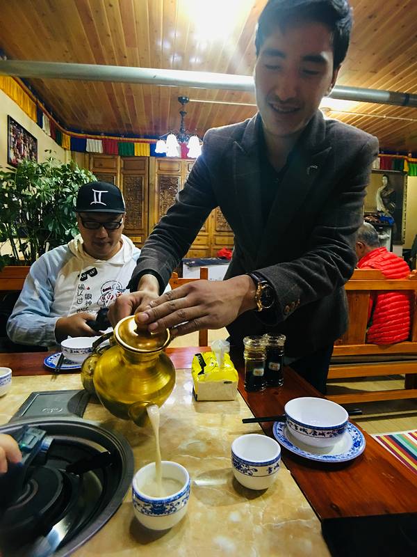 这时,我也有精力去细细的品味这藏式风格与现代相结合的房间了,房间宽敞,床很大,对我这种小个子女生来说,简直奢侈,各种摆件,挂画,也都贴合藏式主题,细心的酒店怕客人干燥,给每一个房间都配备了加湿器,感觉甚好,打开窗,独克宗古城风景尽收眼底,高原上独有的清冽的气息扑面而来,嗯~~是她—我向往的香格里拉。超喜欢这个飘窗啊~捧一本书窝在飘窗上,喝杯热茶暖暖手,舒服。若不是肚子饿的咕咕叫,我还真想赖在房间里不愿出去,夜晚的香格里拉真是太冷了,裹上我最厚的衣服,顶着寒风走进了独克宗古城,来到了四方街,看到了独具当地特色的少数民族“广场舞”,大家手牵着手一起舞蹈,好不热闹。找了一家当地的特色餐厅,大快朵颐,第一次喝酥油茶,分不清是花生还是芝麻的香气,口感浓郁,略咸,正是我喜欢的味道,一口气喝了好几杯,正宗的牦牛肉火锅,特别适合我这种怕冷星人,御寒,生暖,青稞饼也成了我的最爱,和披萨差不多大小,我一口气吃了2块,真满足。酥油茶原来是这样的,颜色有点像芝麻酱?但是真的挺好喝的。今天是最累的一天,但初见香格里拉,有一种莫名的欣喜,回酒店的路上,我心里默念着,明天一定要是一个好天气呀,晚安。 展开