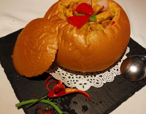 餐厅环境宽敞舒适,装修充满异域风情的。主打粤菜、东南亚风味菜系。香茅烤鸡,油亮酥脆的鸡皮看上去让人食欲大增,别有一番风味;石锅咖喱虾,散发着浓浓的咖喱香气,拿来拌饭最好不过;酥皮豆腐也是特色之一,小巧玲珑的豆腐块,香酥脆口。