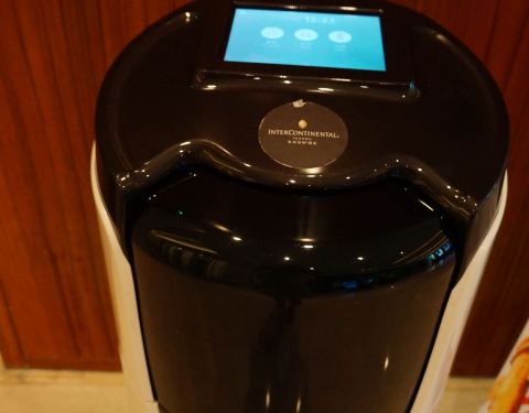 中午退房后打车去洲际酒店中餐厅吃饭。苏州洲际酒店是有些年份的酒店了,设施看上去比较旧,但是老底子的贵气还是有的。一进门,周爷叔就说,这个酒店看上去比我们住的高级嘛。 洲际酒店也有机器人, 娃娃吃饭...
