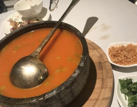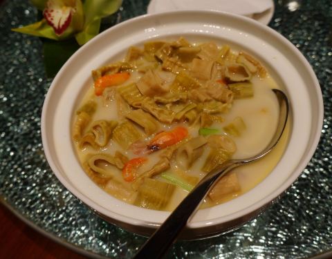 中午退房后打车去洲际酒店中餐厅吃饭。苏州洲际酒店是有些年份的酒店了,设施看上去比较旧,但是老底子的贵气还是有的。一进门,周爷叔就说,这个酒店看上去比我们住的高级嘛。 洲际酒店也有机器人, 娃娃吃饭的时候跑过来好几次,为了看机器人。 绣中餐厅属于黑暗色系,进门一排苏绣。不太喜欢这个黑暗的调调。洲际会员可以打折,不收服务费 上菜非常慢,幸亏我们不饿。河虾烧笋干很好吃,笋很嫩,汤底鲜美,就是虾实在少,只有3只。 娃娃吵着要吃面面,餐厅没有苏式面, 只能点38元一小碗的黄鱼面。