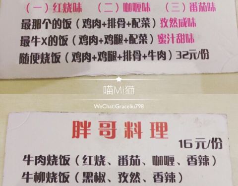 胖哥料理 兆丰路5号 近乐宾百货 一家藏在巷子里的小饭馆 主打:盖浇饭 生活在和平区的人应该都知道 从上学一直到现在 后来迁址至此 那时候胖哥还年轻 盖饭5块钱一份 同学们都爱来这吃 量大味道好 关键胖哥还给每种饭都起了个有意思的名字 比如: 【最牛叉的饭】 16 蜜汁甜味的盖饭 里面有鸡肉 配菜 还有一个鸡腿 这也是我经常吃的一种盖饭了 【最那个的饭】 16 孜然咸味的盖饭 里面有鸡肉 排骨和配菜 也是我喜欢吃的一种 甜味咸味各有各的特色 几乎每种都是16元 还有牛肉 牛柳 鸡肉 排骨 烧饭 可以做成红烧 番茄 咖喱 香辣 黑椒等口味 当然你也可以告诉胖哥喜欢什么样的 让他作出只属于你的盖浇饭 还有汤和饮料 冬天喜欢喝汤 夏天来瓶汽水 完美 环境来说 胖哥追求纯天然 完美没有重新装修 坐落在一幢小房子的二楼 门口有醒目的招牌 虽然在小巷子里 还是比较好找的