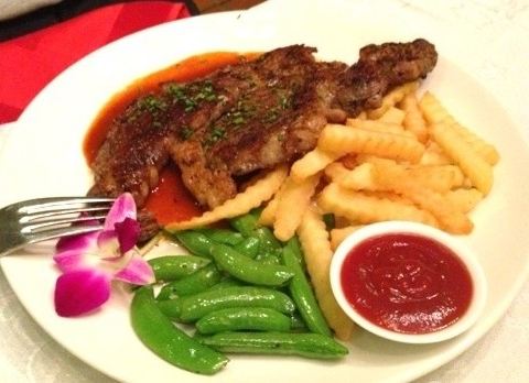 花园式的西餐厅,环境很好,面积非常大。奶油蘑菇汤,味道浓郁,挺好喝的。西冷牛排,一定要点上一份,牛肉肉质很嫩,味儿不错。