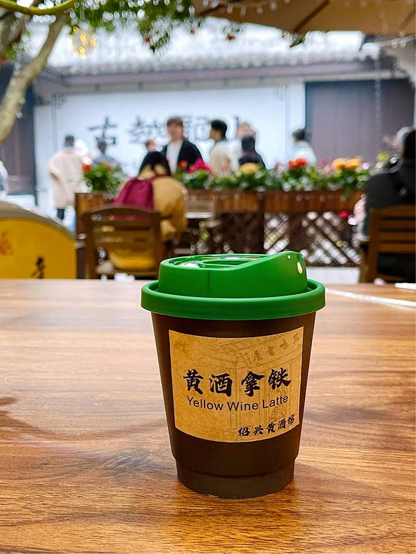 在鲁迅故里景区里随便逛着,路过这儿,最里边好像是黄酒展示还是售卖,记不太清了。 景区逛得有点累了,正好在这里歇歇脚。咖啡队友建议尝试一下黄酒拿铁,怕味道很奇怪,就只点了一杯;体验下来就是拿铁略有一丢丢酒味,不难喝,但也没有什么特别之处。 一小杯价格也不便宜。